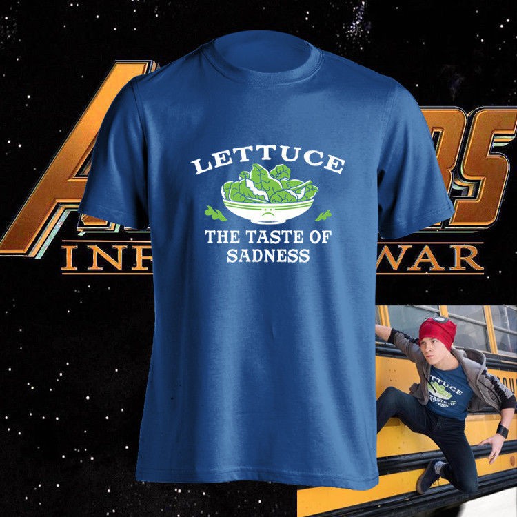 Decrum Mens Blue Lettuce Spider-Man Infinity Wars Avengers Shirt Casual Logo Outfit Lettuce XL. Peter Parker is not a salad guy. Lettuce The Taste of Sadness T-Shirt worn by Peter Parker Tom Holland as seen in Avengers.
